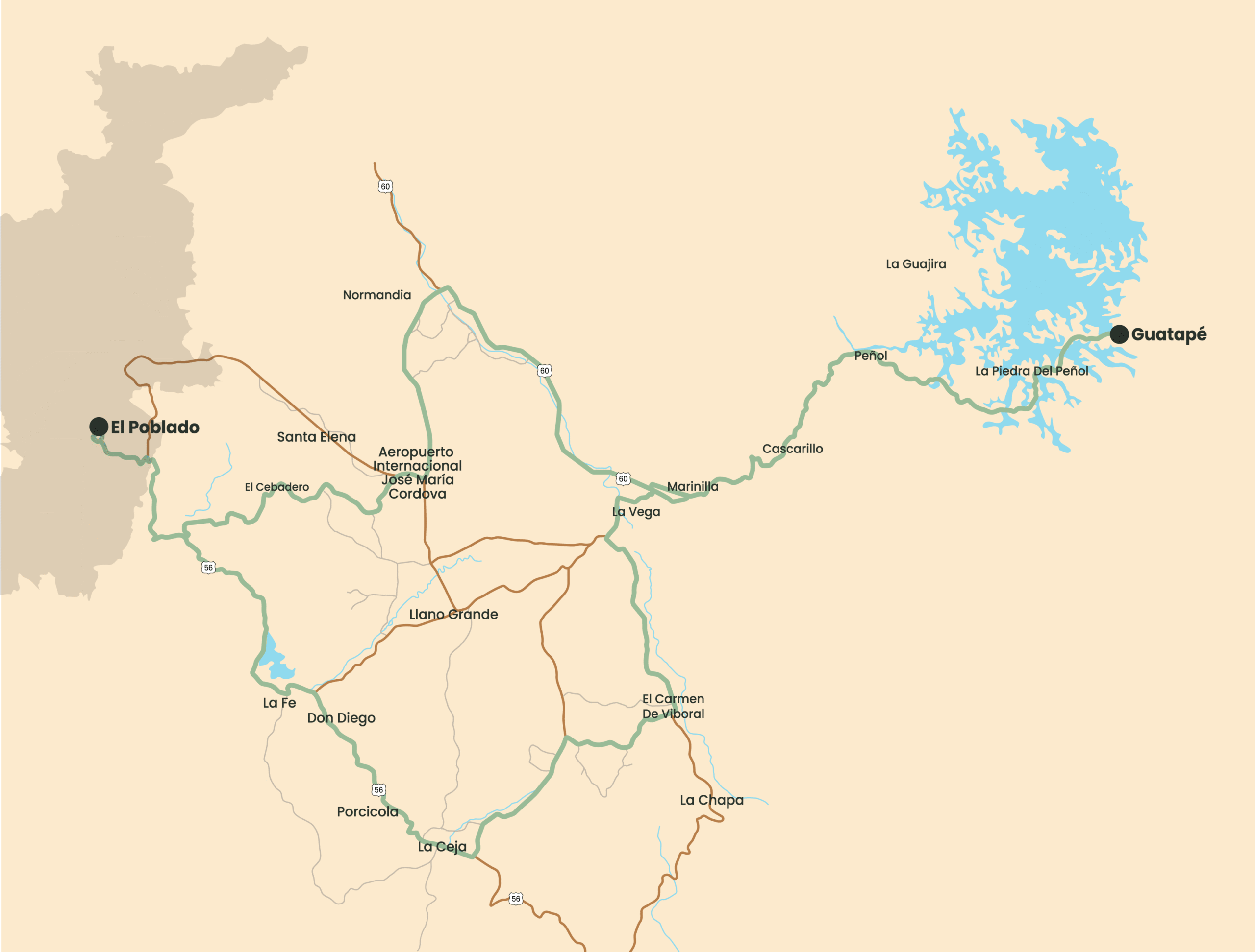 Day X: Medellín → El Retiro → La Ceja → Guatapé → San Rafael → San Carlos → Medellín | Total kilometers: 230 km (aprox.)