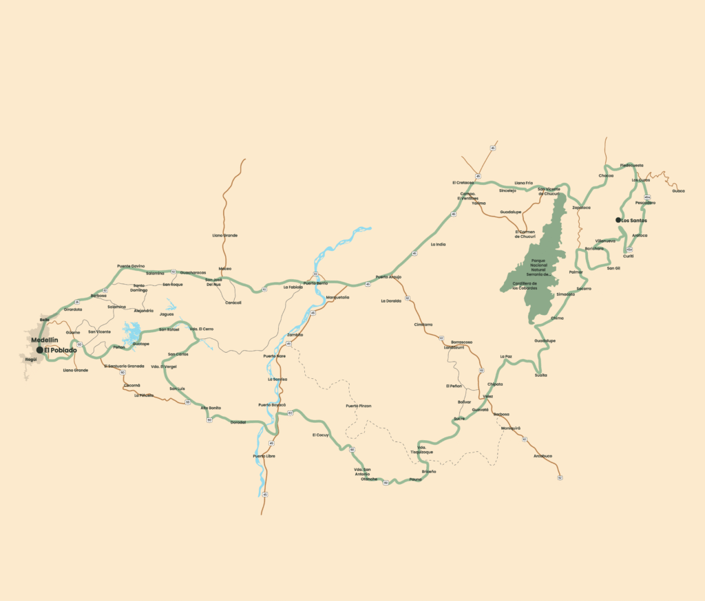 Highlights: Guatapé Rock, Hacienda Nápoles (Doradal), Emerald country off-road to Otanche, Ventanas de Tisquizoque Waterfall, historic pueblos Vélez, Guadalupe, Socorro, Barichara, Zapatoca, and Los Santos, Las Gachas natural rock pools (near Guadalupe), Chicamocha Canyon National Park descent and views, Cascada Manchego and Cascada de los Caballeros (optional), San Gil (Adventure Capital of Colombia), San Vicente de Chucurí, and a high-speed highway return to Medellín.