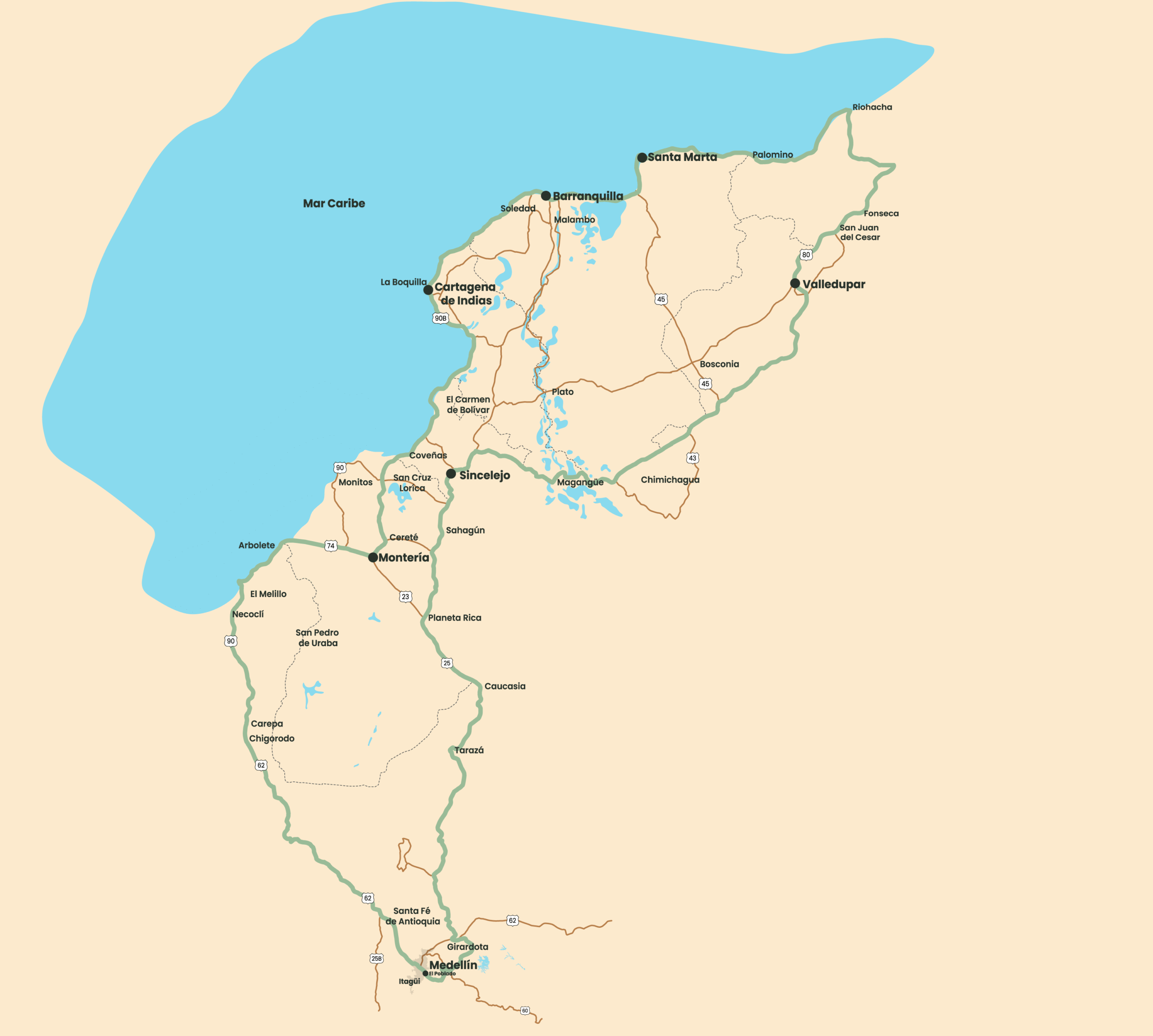 Highlight: Colombia’s Caribbean lowlands, from cattle towns like Planeta Rica and Sahagún, to artisan hubs like Chinú and Sampués, then on through Sincelejo, Corozal, and riverside Magangué, before ending in the colonial jewel of Mompox, a UNESCO World Heritage Site.